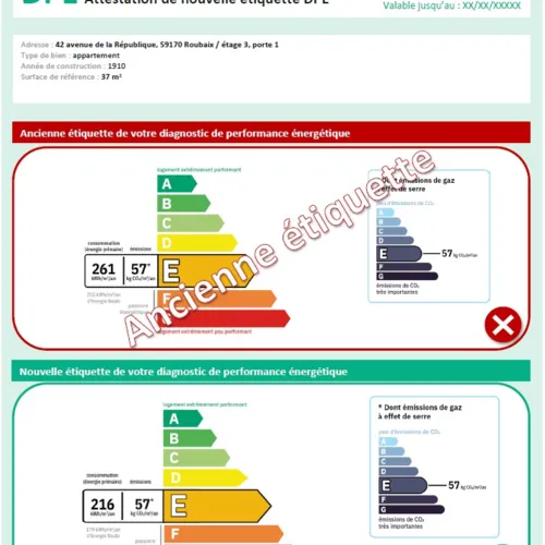 Depuis le 1er janvier 2026, votre étiquette DPE ou AUDIT peut avoir évolué suite à la réforme du facteur de conversion en énergie primaire de l'électricité.Actualiser vos DPE au 1 janvier 2026 (avec chauffage et ou production d'eau chaude sanitaire électrique) --> cliquer sur le lien du numéro ADEME de votre DPE et vous serez redirigé directement sur le site de l'ADEME (Agence de l'environnement et de la maîtrise de l'énergie ) pour éditer votre nouvelle étiquette DPE .https://www.service-public.gouv.fr/particuliers/vosdroits/R67366
